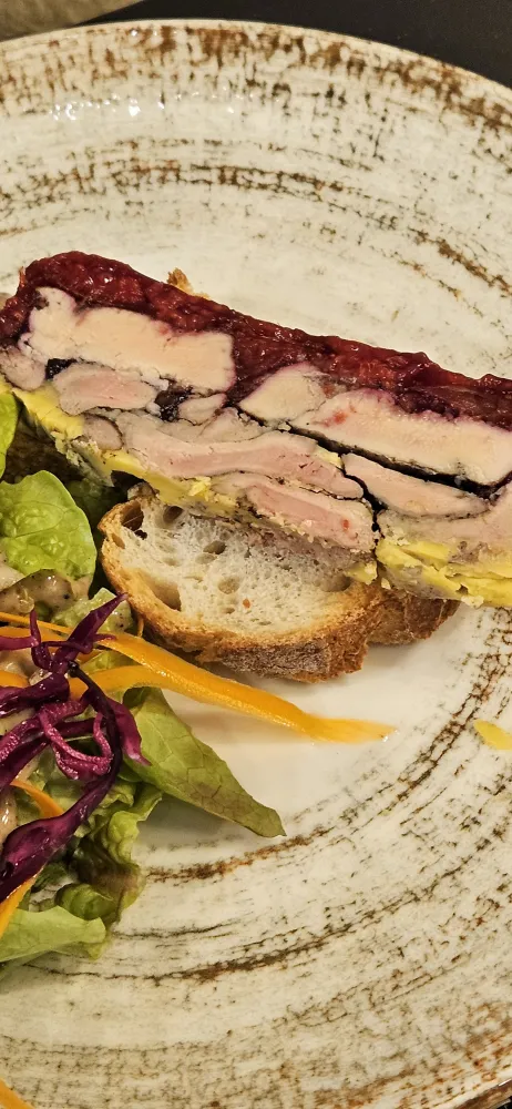 Découvrez notre terrine de foie gras maison, subtilement mariée aux figues et framboises pour une touche sucrée-salée raffinée.