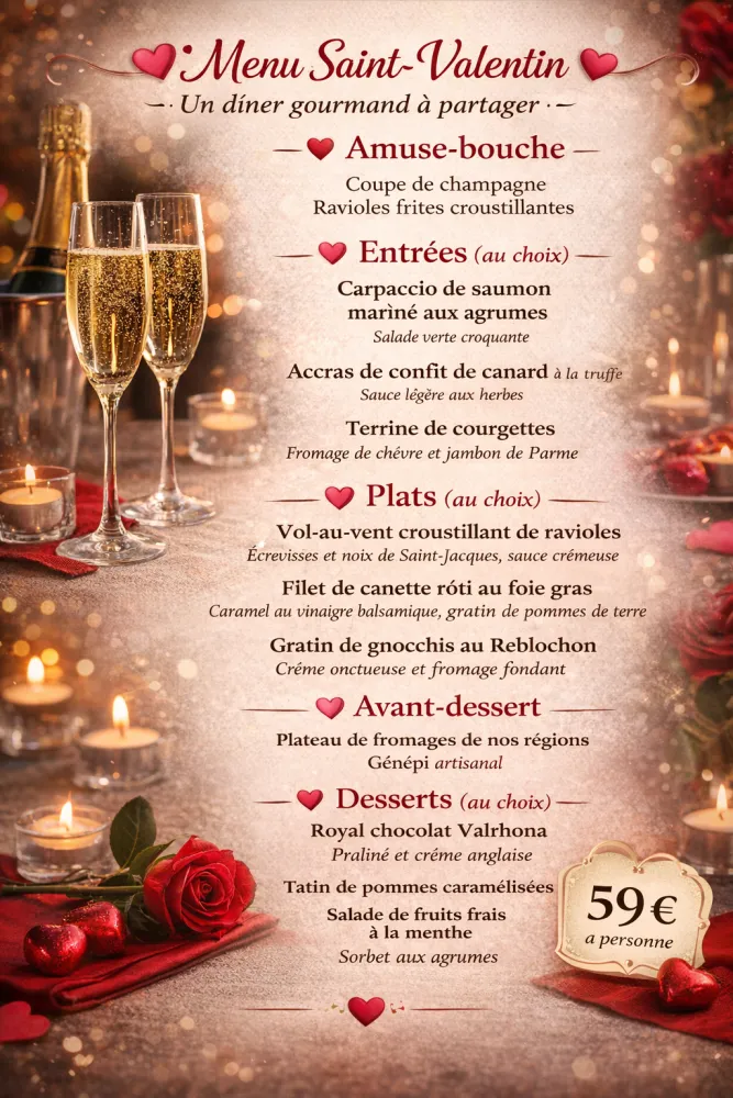Ce menu met à l’honneur des assiettes gourmandes, des saveurs franches et une ambiance chaleureuse, idéale pour célébrer l’amour autour d’une belle table.