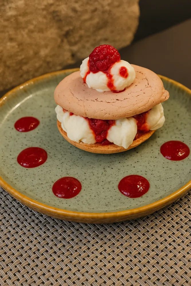 Un dessert tout en finesse : deux coques moelleuses garnies d’une crème légère et d’un cœur de framboises fraîches.