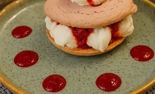 Un dessert tout en finesse : deux coques moelleuses garnies d’une crème légère et d’un cœur de framboises fraîches.