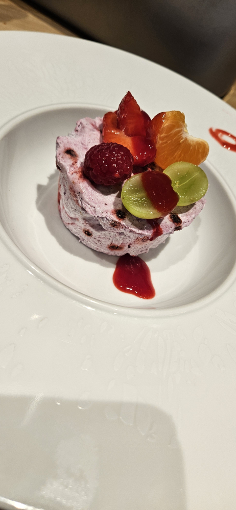 Une texture fondante, un coulis fruité et des fruits frais pour finir le repas sur une note parfaite.