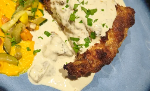L’histoire commence en cuisine.Un beau morceau de volaille, farci au Saint-Nectaire bien de chez nous.On pane à la main....